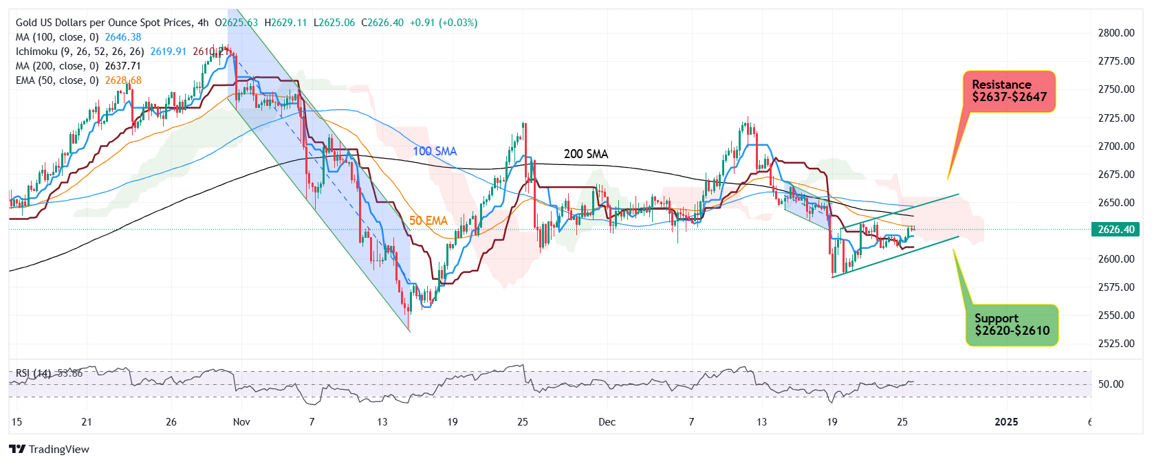 由于缺乏机构交易者,市场缺乏强劲的交易量。 市场交投清淡,但金价仍维持在 2624 美元支撑位上方。 接下来的支撑位为 2620 美元和 2610 美元,接下来的阻力位为 2637 美元和 2647