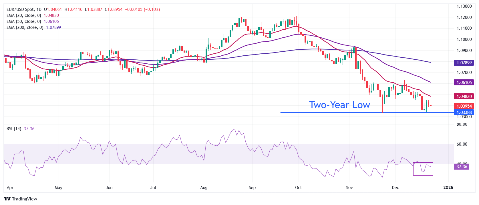 周二欧洲时段,欧元/美元在 1.0400 附近窄幅波动。由于周三和周四外汇市场分别因圣诞节和节礼日而放假,交易量清淡,导致该货币对的价格走势平淡。 欧元/美元的整体前景看跌。欧元 (EUR) 周一小幅