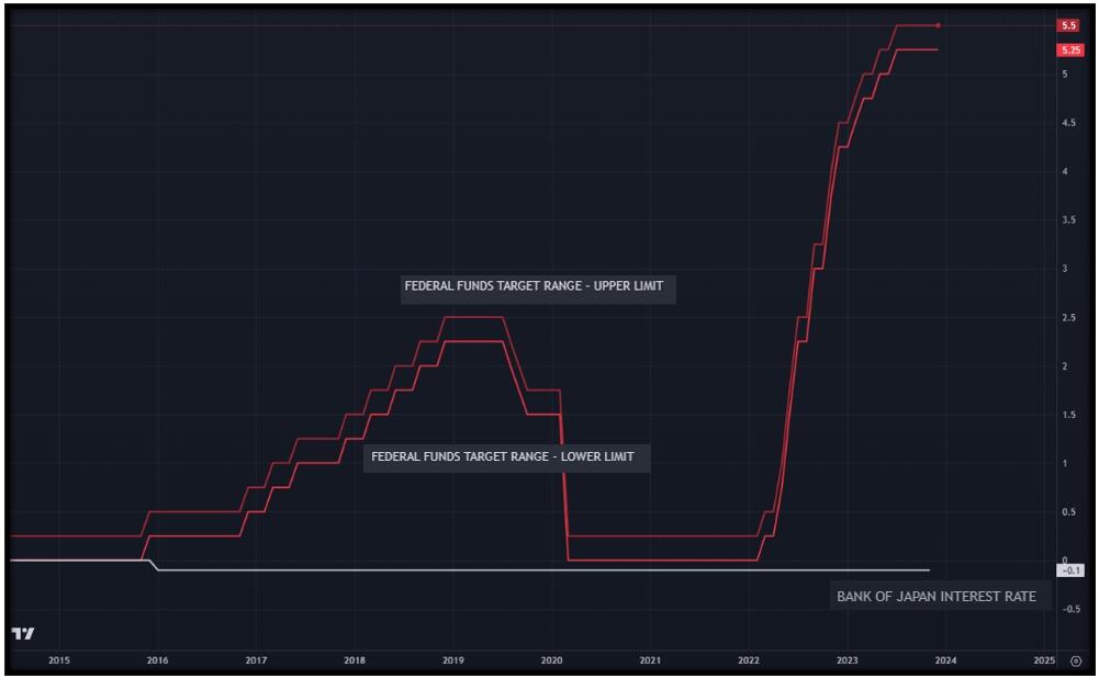 美元兑日元在2023年上涨了10%以上,这种表现在2024年很难重现。 美联储(fed)和日本央行(boj)在货币政策上的分歧,导致该货币对测试了近152.00的数十年高点。 在未能突破152.00之