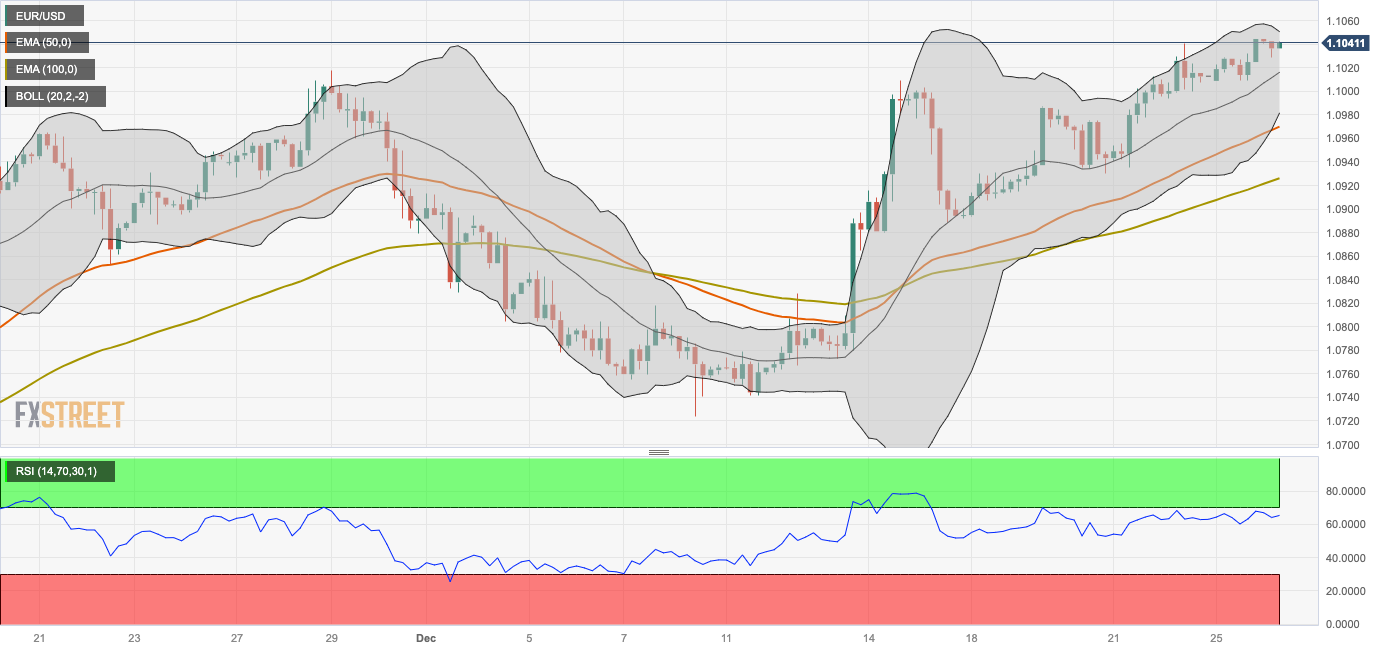 周三欧市早盘,欧元/美元窄幅震荡。在2023年最后一周的假期期间,欧元/美元可能会比较平静。欧元/美元交投于1.1041附近,日内跌幅为0.01%。 4小时图显示,欧元/美元看涨前景依然完整,欧元/