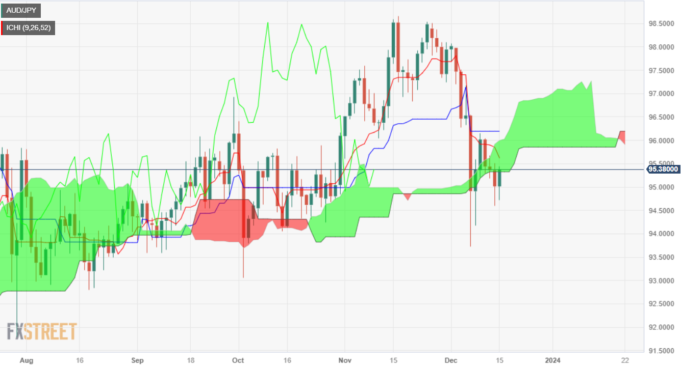 澳元/日元涨幅愈 0.30%,从日内低点 94.72 反弹后交投于 95.40 附近。上周澳元/日元收盘微幅上涨 0.15%。 尽管澳元/日元上周跌破了一目均衡云图(Kumo),但仍收盘上涨。另外澳