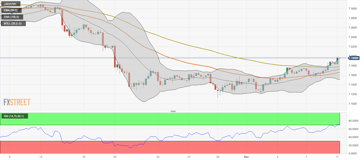 美元/离岸人民币处在超买,上涨突破7.1950,美国通胀和美联储决议成为焦点