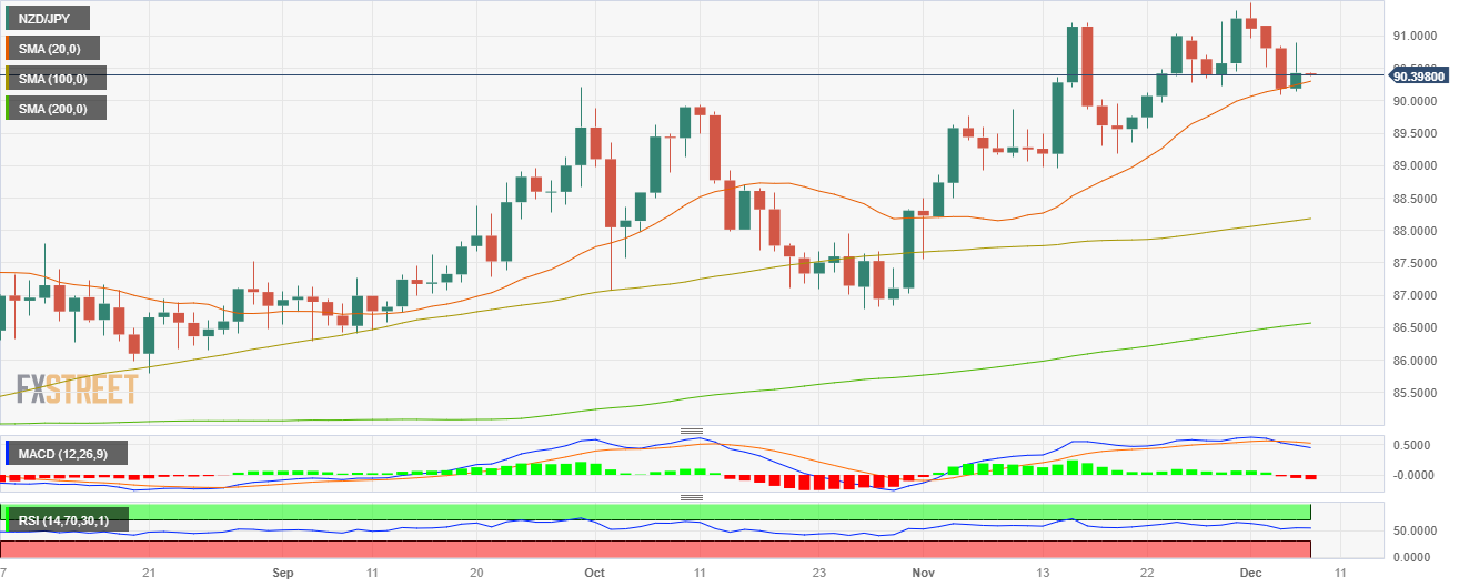 周三盘中,纽元/日元交投于 90.40,继盘初触及高点 90.90 后微跌 0.25%。 日线图上的指标显示出看涨动能耗尽的迹象。相对强弱指标仍持平于正值区域,而MACD指标则显示出红色柱状上升,倾
