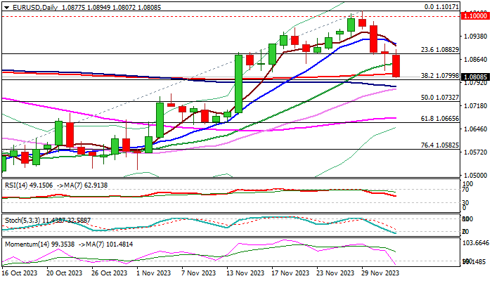 欧元空头在周一全面回归,此前由于美联储主席鲍威尔的讲话,欧元跌至三周低点后出现短暂停顿。 该货币对在美国时段午盘前下跌超过0.5%,突破了1.0818(200日均线)的关键支撑位,将寻求强势跌破该位的