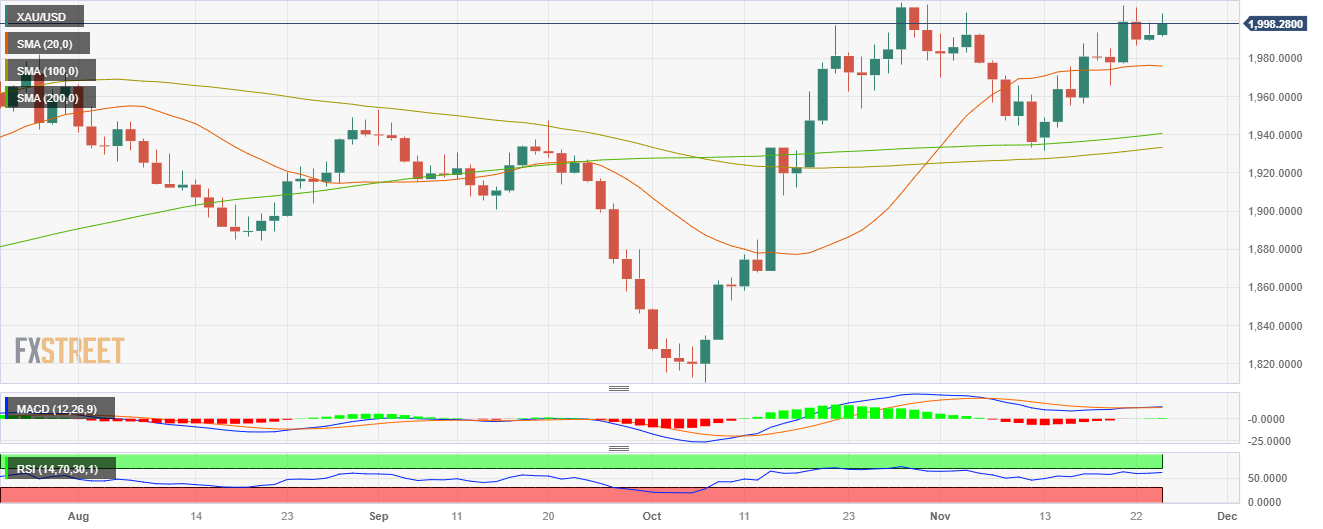 黄金/美元 在周五的交易中受到了标准普尔 PMI 喜忧参半和美元走软的影响。该货币对(通常被认为是以美元计价的黄金价格)正在换手,向2000美元靠拢,并出现了0.30%的涨幅。 11 月初,美国私