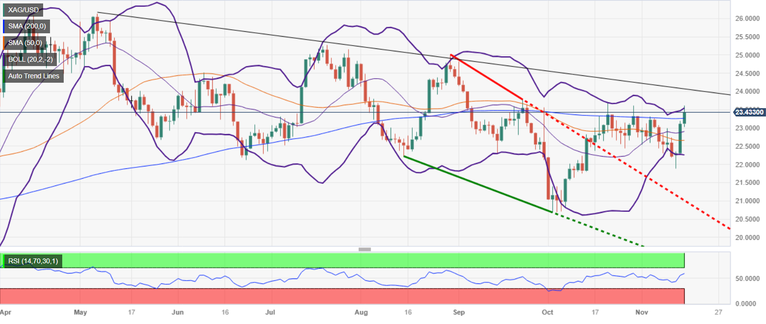 周二美国通胀报告疲软,导致美国国债收益率因预期美联储将结束加息而暴跌,银价周三攀升。因此,XAG/USD 大幅走高,触及关键阻力位,如位于 23.26 美元的 200 日移动均线(DMA)。如果白银多