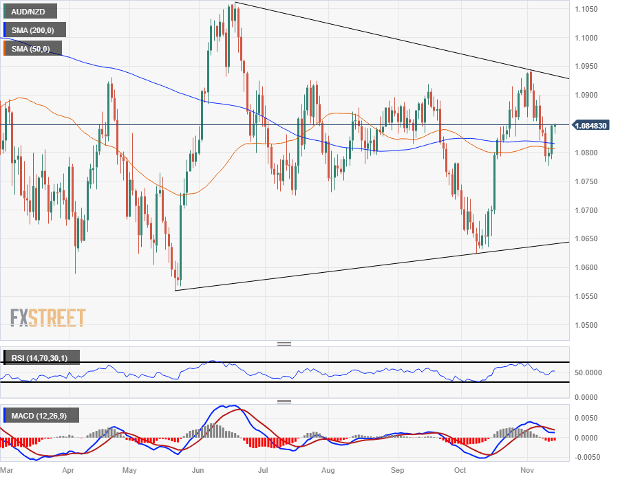 澳元/纽元继连续两周下跌后反弹,已攀升近 0.6%。 小时图蜡烛图显示,澳元/纽元直逼处在 1.0860 紧下方的 200 小时简单移动均线 (SMA)。澳元/纽元 11 月初从 1.0900 下跌