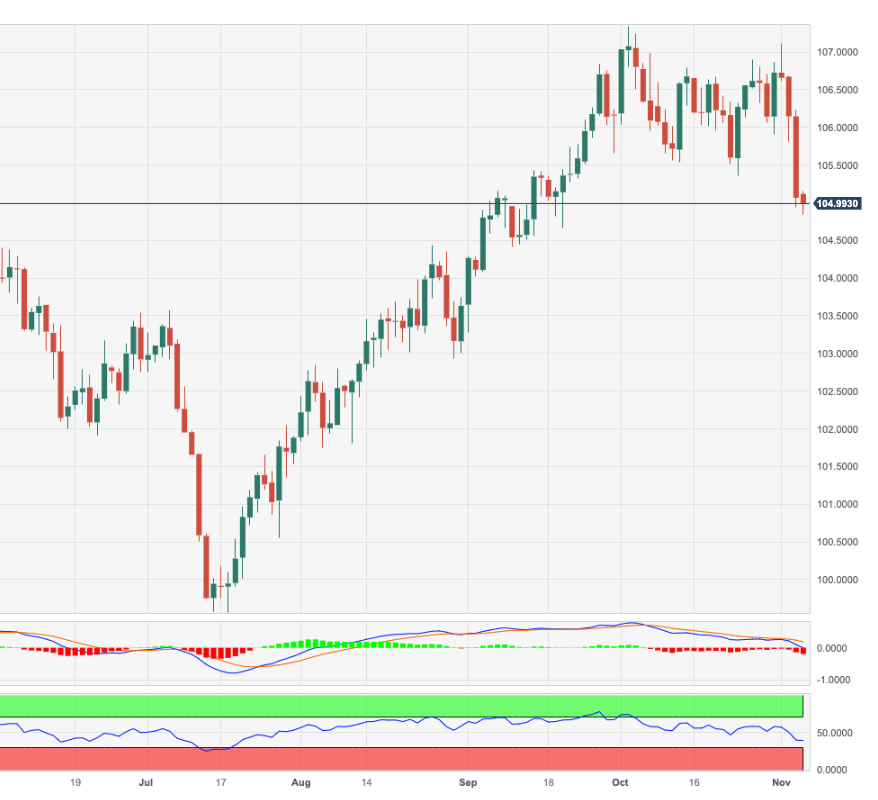 - 美元指数延续下行至 105.00 下方区域。 - 短线支撑位在 104.40 附近。 周一,美元指数加速下跌至 104.80 附近的多周新低。 极短期内似乎可能延续抛售势头。也就是说,下一个
