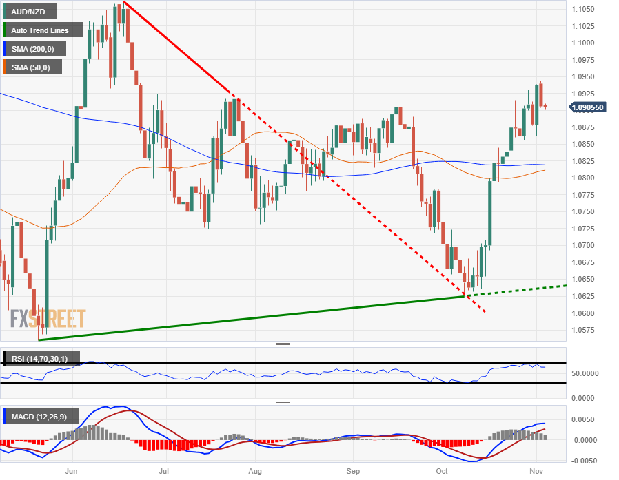 澳元/纽元重新回到1.0900关口,2023年的大部分时间澳元/纽元维持在该水平附近。 澳元(AUD)自 10 月初在 1.0625 附近触底反弹以来出现了强劲回升,但随着日内走势开始呈现耗尽,看涨