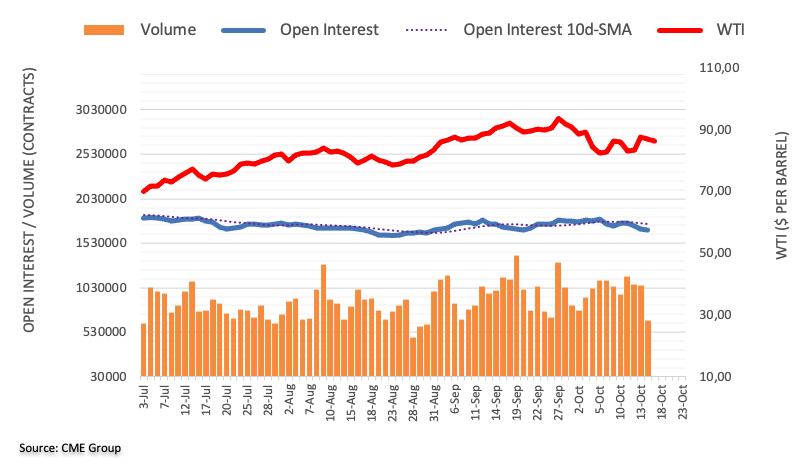 根据芝加哥商业期货交易所集团初步数据,周一原油期货市场的未平仓合约连续第三日下降,目前下降约0.92万份合约。与此同时,成交量连续第三日下降,此次下降约39.75万份合约。 WTI原油:上涨似乎受限