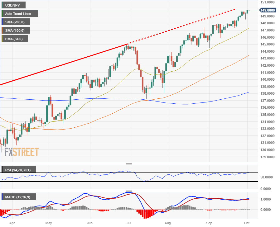 美元/日元上涨至 11 个月来的最高水平,上涨接近 150.00 重要关口,原因是投资者风险偏好回落,风险资金涌入避险货币美元,导致美元全盘上扬。日元(JPY)自9月开盘于145.55附近以来已下跌近
