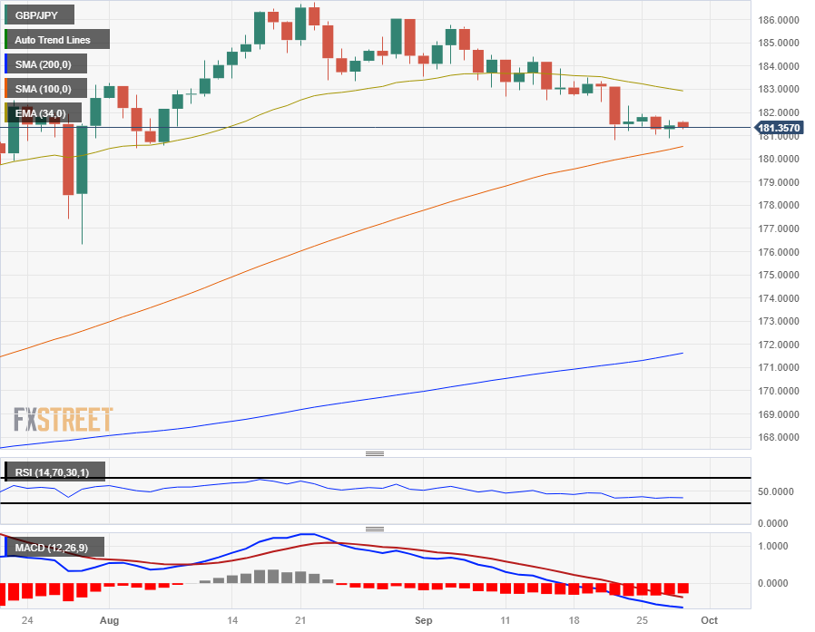 英镑/日元继续挣扎,难以明确方向,英镑/日元 9 月下跌了 1.7%,但上周维持处在 182.00 和 181.00 之间的区间。 本周初,英镑和日元方面的经济数据有限,但上周收盘前,英镑和日元方面