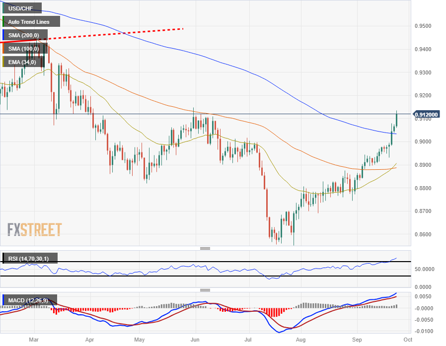 美元/瑞郎在周一交易时段被钉在高位,触及 0.9130 区域。若该货币对继续走高,将测试五个月来的新高。 上周,瑞士央行(SNB)随便地暂停了加息周期,令市场大吃一惊,投资者的预期也落空,上周四瑞士