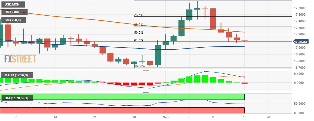 美元/墨西哥比索价格分析:徘徊于61.8%回档位,略高于17.00/50日SMA均线