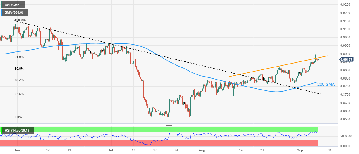 美元/瑞郎小幅上涨至两个月最高水平,进入周四欧洲时段在0.8920附近缺乏动能。 该货币对多头在3周前的上升阻力线陷入挣扎,同时RSI超买。不过成功突破5月底以来的前阻力线以及200SMA令多头充满