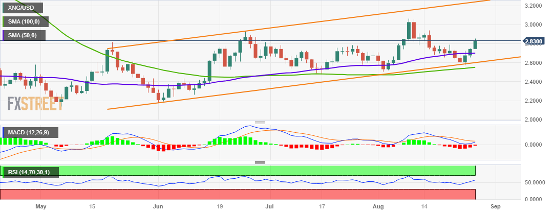 天然气价格自上周四触及的多周低点 2.5760 美元附近大幅反弹基础上,连续第三天获得强劲的后续动能。周一亚市,天然气价格跳涨至 2.8560 美元区域,即近两周高位,似乎有望进一步上涨。 过去两个
