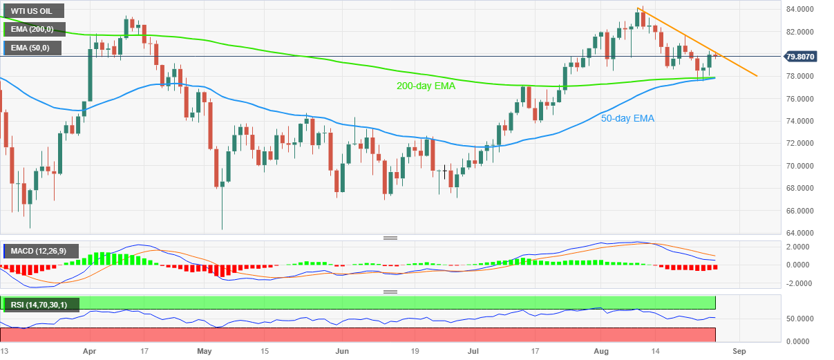 进入周一欧洲时段,WTI原油价格依然小幅承压于79.80美元附近,自两周阻力线反转录得三日内首日下跌。油价也印证MACD信号看跌,难以利用美元走软以及中国消息引发的风险偏好情绪。 自8月9日以来的下