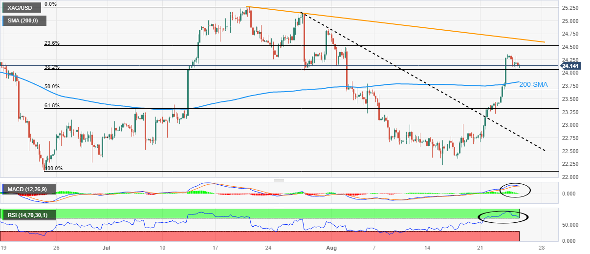 周五亚市早盘,银价前日从三周高点反转后,仍承压于 24.15 美元附近。日内杰克逊霍尔研讨会上,包括美联储(Fed)主席杰罗姆-鲍威尔(Jerome Powell)在内的顶级央行行长将发表讲话,在此之