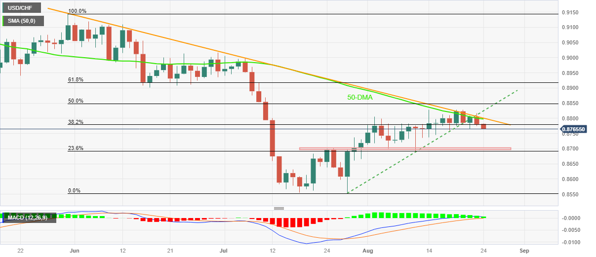 进入周四欧洲时段,美元/瑞郎下跌至一周最低水平,在0.8765附近刷新盘中底部。该货币对录得两连跌,延续前日自50日均线和三个月下降阻力线的反转。 不仅未能突破关键均线和趋势线阻力,同时持续交投于周