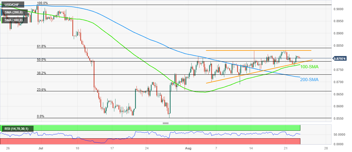 进入周三欧洲时段,美元/瑞郎徘徊于0.8800附近,前日自100SMA的反弹行情消退。该货币对的走势反映了美国8月制造业PMI初值数据前的市场谨慎情绪。 除了回撤指向0.8780附近的100SMA均