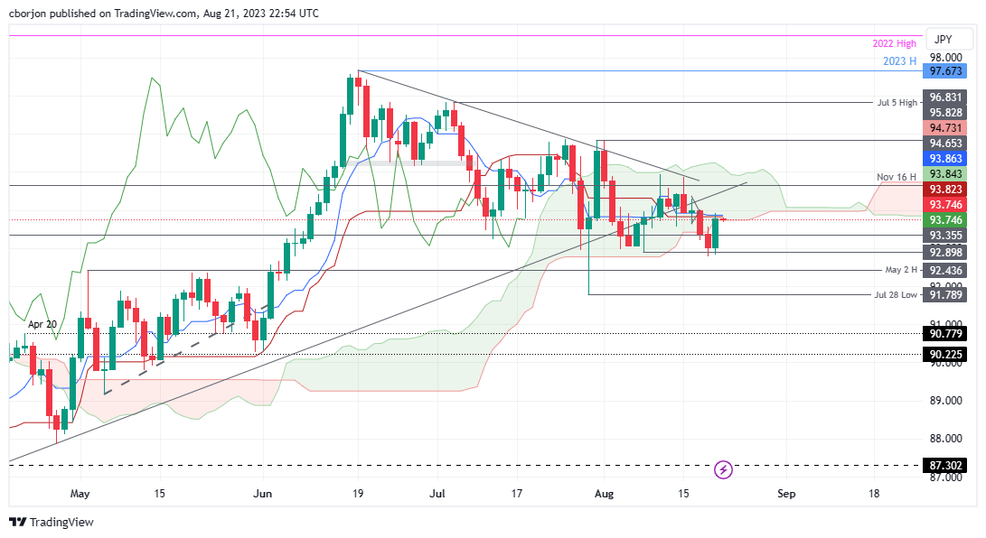 澳元/日元在 93.77 附近徘徊,周一盘中澳元/日元上涨0.81% ,上涨至一目均衡图云图内。也就是说,澳元/日元必须夺回94.93关口,这样才能转为看涨。 澳元/日元价格分析:技术前景 从技术