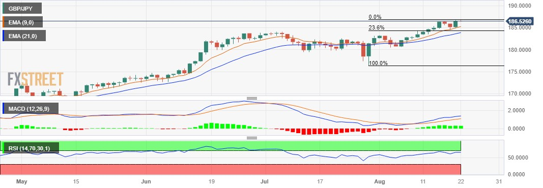 英镑/日元价格分析:延续连涨势头,交投于高位 186.77 附近