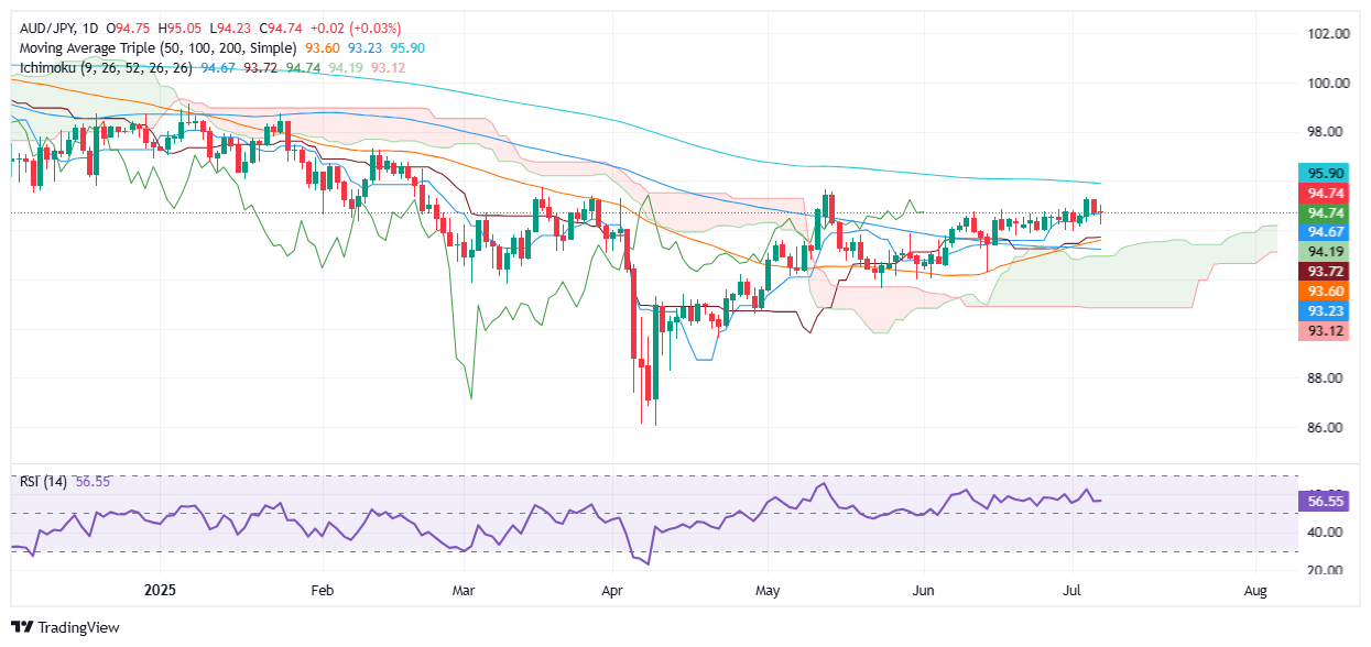 周一,澳元/日元小幅上涨,涨幅为0.17%,收于94.79附近,交易者消化了白宫的行动,白宫向多个国家发送了几封信件,对其进口到美国的商品征收关税。尽管这通常会引发风险规避情绪,但日元未能获得动能