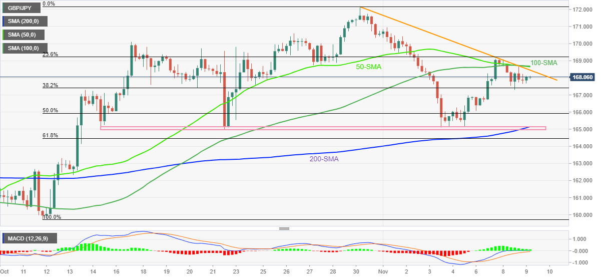 英镑兑日元在前一日结束两日升势后于周三伦敦时段开盘前在168.00附近试探了多头。 周二该交叉盘自50SMA和100SMA均线反转后自10月11-31日期间升势的38.2%的斐波回档位反弹。 不过