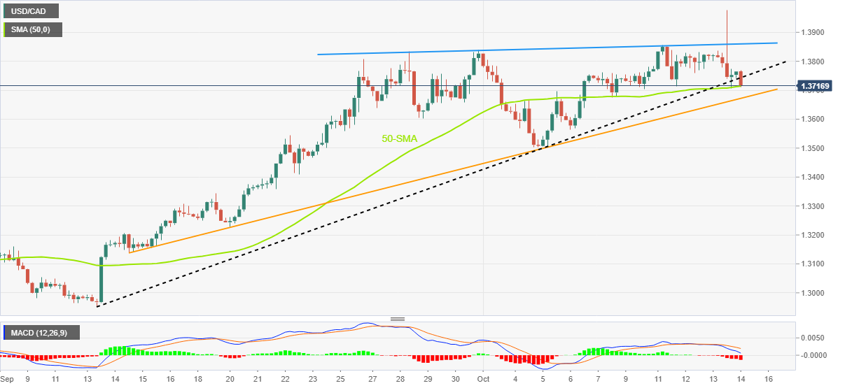 周五欧市早盘,美元/加元在1.3710附近刷新日低点。汇价延续周四跌势同时试探了50SMA均线的支撑位。 不过值得注意的是,MACD信号看跌且汇价持续性突破9月13日以来的上行趋势线有利于空头。
