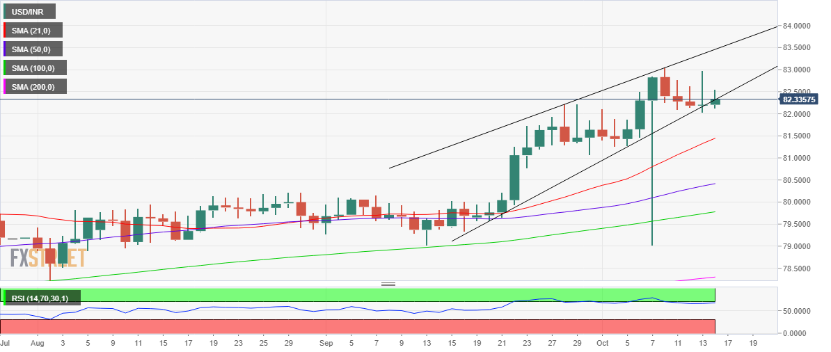 美元/印度卢比:收盘于82.32下方将确认跌破上升楔形形态