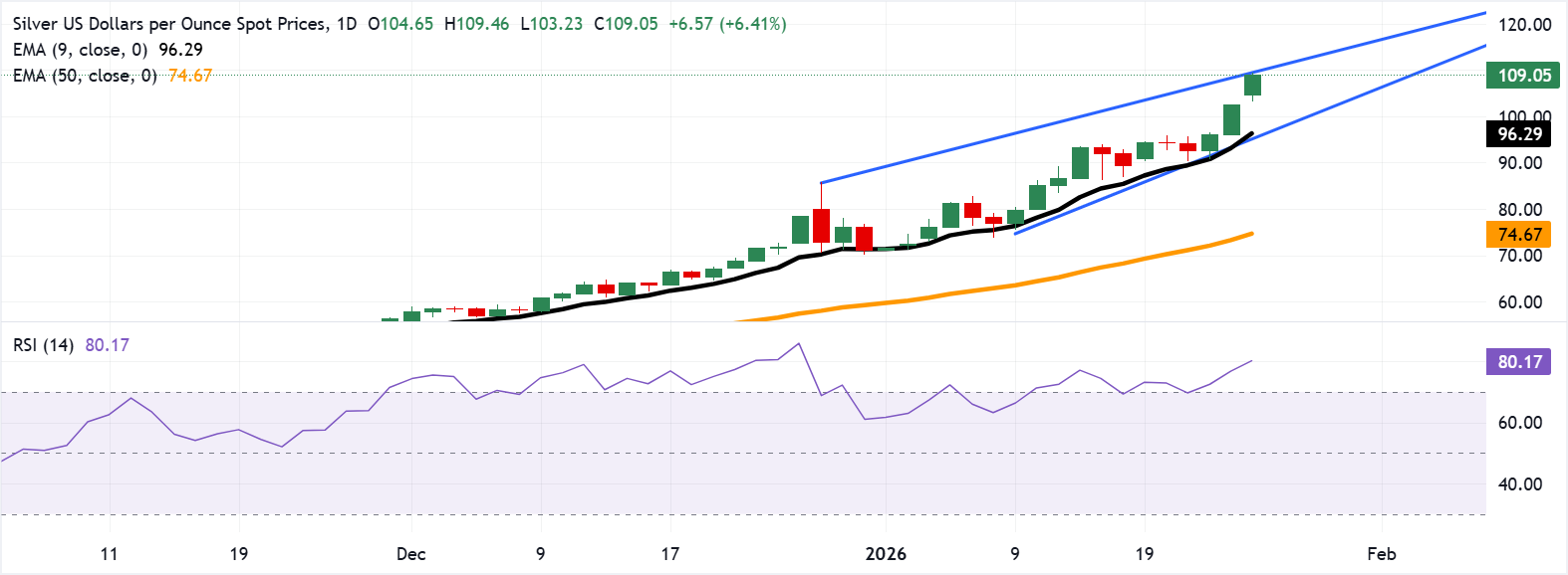 银价(白银/美元)连续第三个交易日上涨,周一亚洲时段交投于每盎司108.80美元附近。