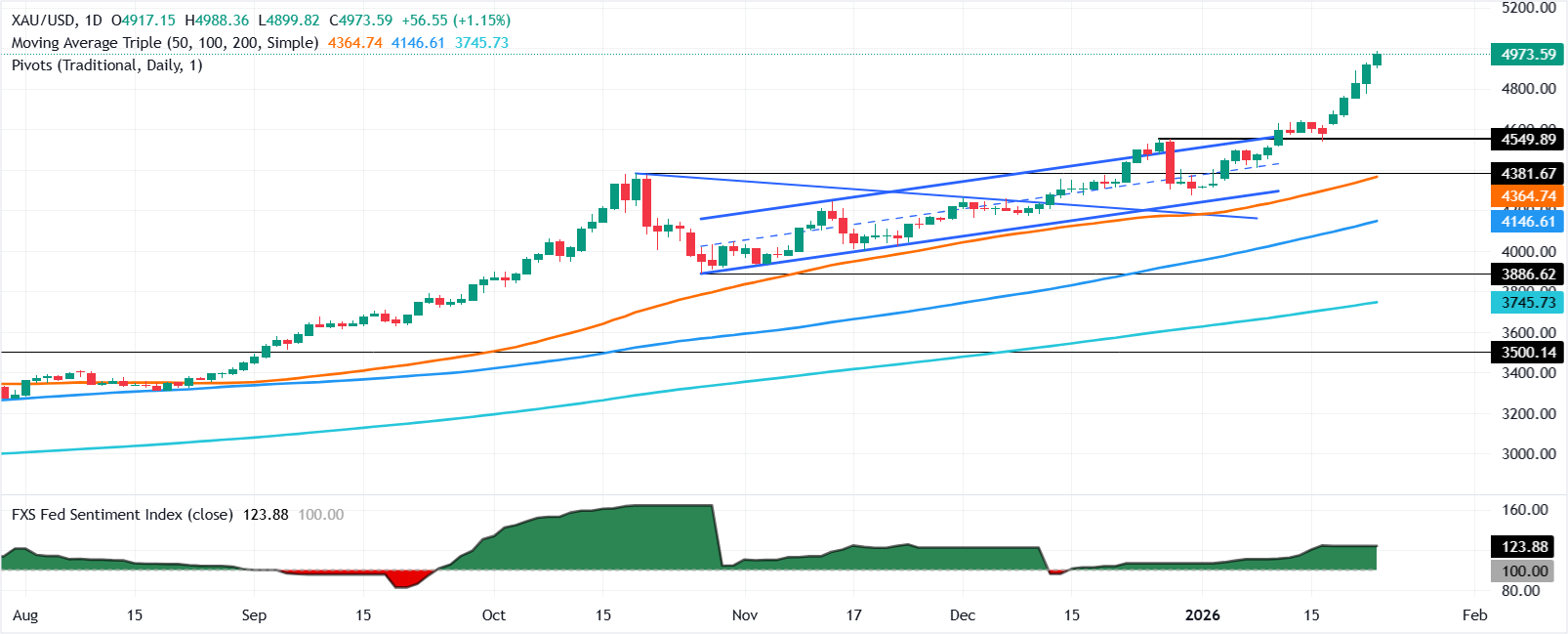 黄金(黄金/美元)在周五北美交易时段大幅上涨,涨幅超过1%,因美元(USD)因干预传闻遭受重创,推动日元(JPY)在外汇市场上走强,同时风险偏好的改善将黄金推升至新的历史高点4,988美元