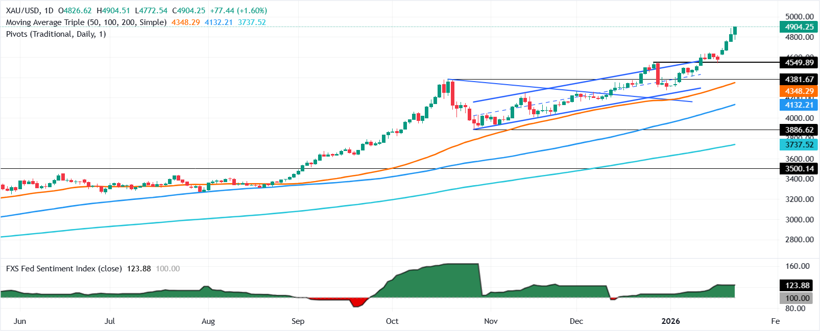 黄金(黄金/美元)在周四连续第四个交易日飙升,创下4906美元的新高,尽管风险偏好改善且美国与欧洲之间的紧张关系在关于格林兰达成协议后有所缓解。截至发稿时,黄金/美元交易于4903美元,日内上涨1.6