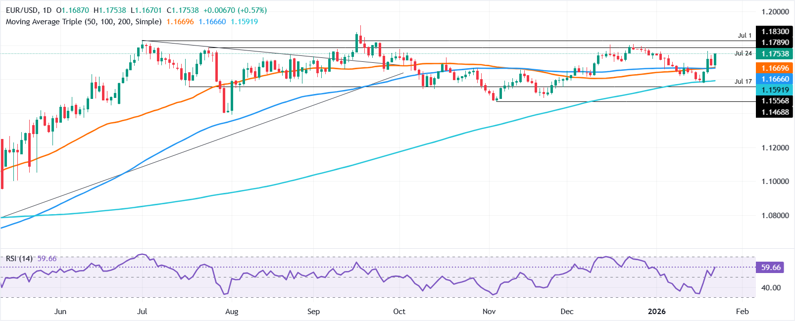 欧元/美元在特朗普放弃关税威胁后上涨至1.1740以上,美元下滑