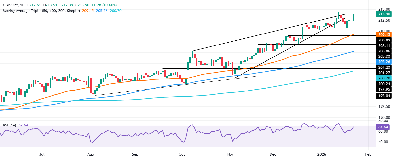 英镑/日元上涨至213.98的新周高点,本周上涨超过1.10%,因英国经济数据喜忧参半,推动英镑走高。关于高市长高市的财政担忧削弱了日元。该交叉货币对目前交易于213.85,上涨0.58%。