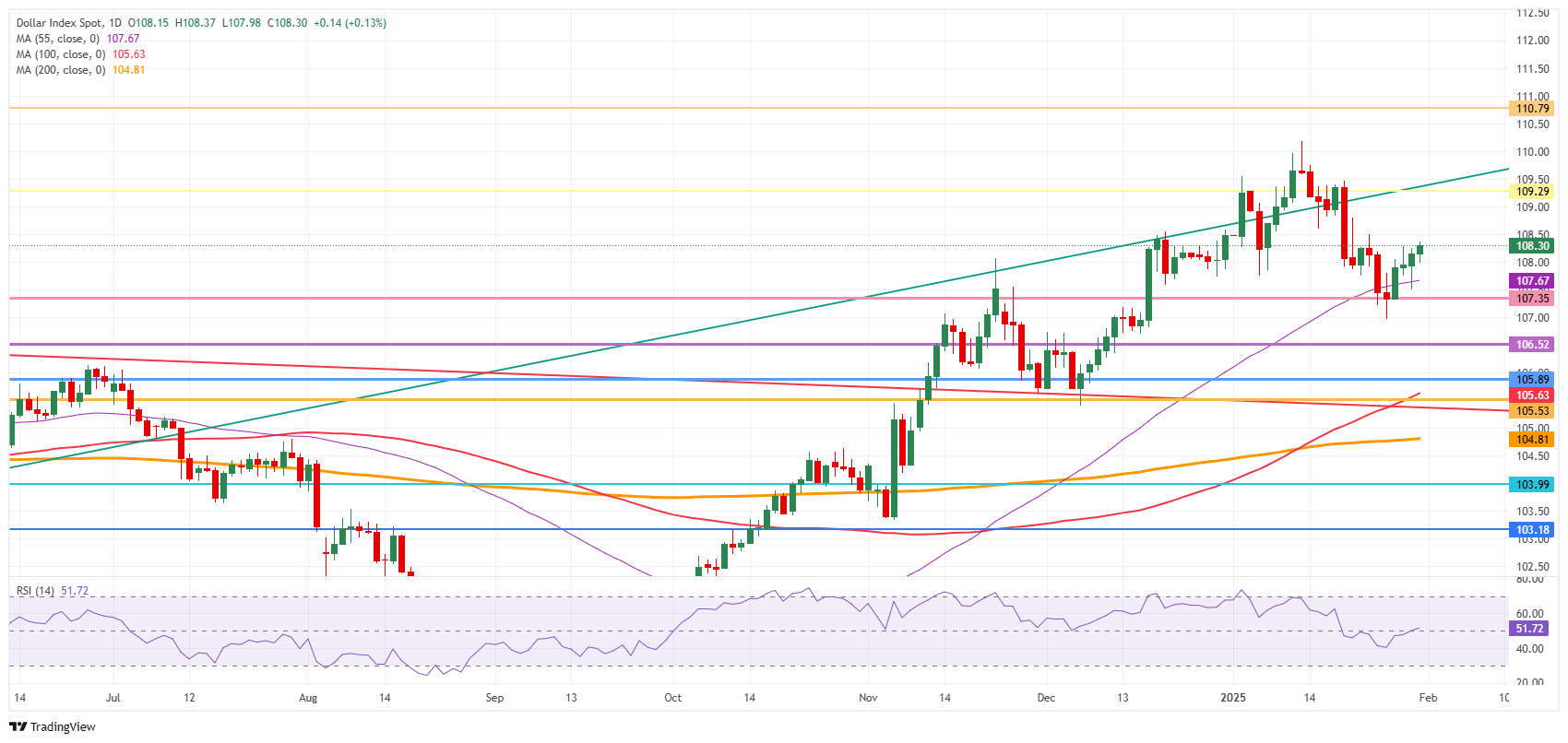 美元指数(DXY)追踪美元兑六种主要货币的表现,目前交易价格为108.35,在周五接近周末时受到了多个利好因素的推动而走高。第一个利好因素来自美国总统唐纳德·特朗普