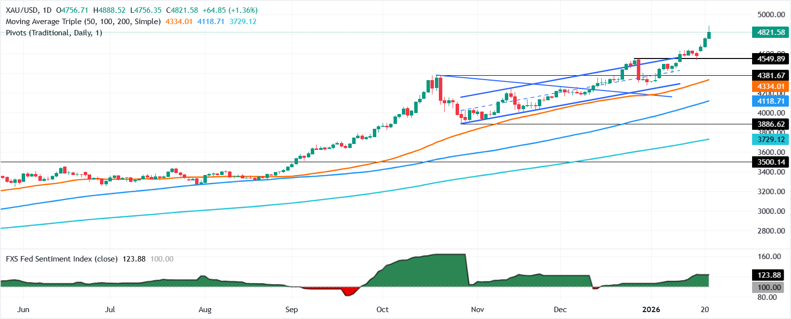 黄金(黄金/美元)在周三的北美交易时段上涨0.25%,此前在当天早些时候从创纪录的4888美元回落。美国总统唐纳德·特朗普对格林兰的语气有所缓和,表示不考虑使用军事力量。截至发稿时,黄金/美元交易于4