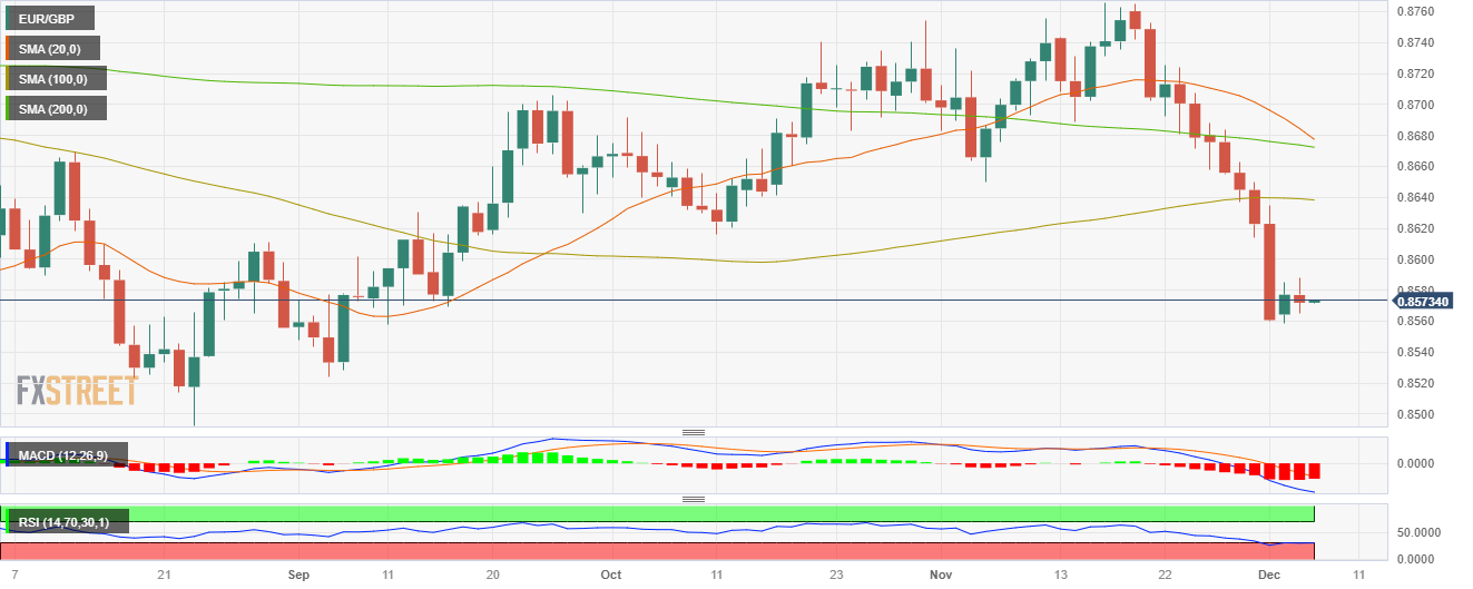 日线图相对强弱指标深处负区,而MACD指标走出平缓的红柱,强化了看跌观点。此外,欧元/英镑位于 20 日、100 日和 200 日简单移动均线下方,强调了持续的看跌倾向,对多头构 标题:欧元/英镑下跌,空头继续夯实跌势