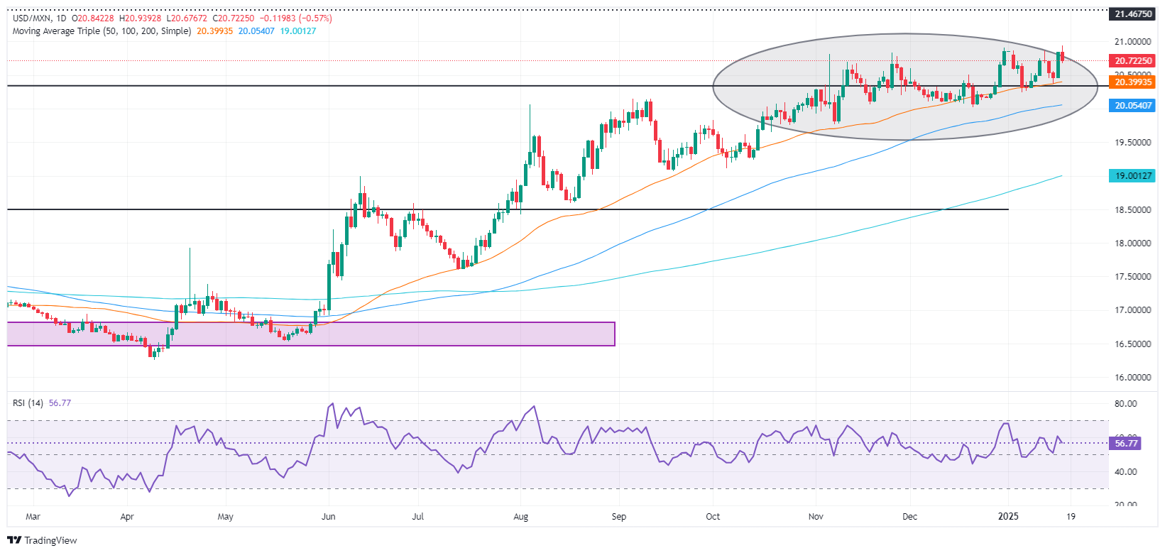 由于中国乐观的GDP数据改善了风险偏好,墨西哥比索(MXN)在贬值至年度新低20.93后回升,并对美元升值。 标题:墨西哥比索飙升,交易员关注下周的通胀数据