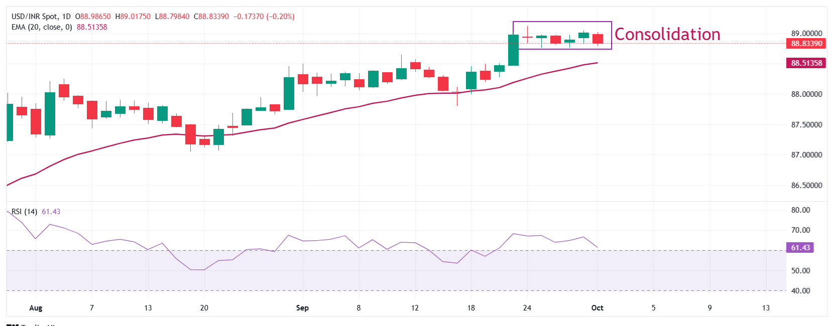 02 Oct 2025 美元/印度卢比价格预测:在89.00附近横盘整理已达一周 1 美元/印度卢比(USD/INR)在周三以0.2%的回调结束,接近88.83。该货币对在周三面临卖压,此前印度储备银行(RBI)发布了货币政策声明。周四,由于杜舍拉节和甘地诞辰,印度货币市场休市。 标题:美元/印度卢比价格预测:在89.00附近横盘整理已达一周 地址:www.shudhfilmynews.com/article/44576.html