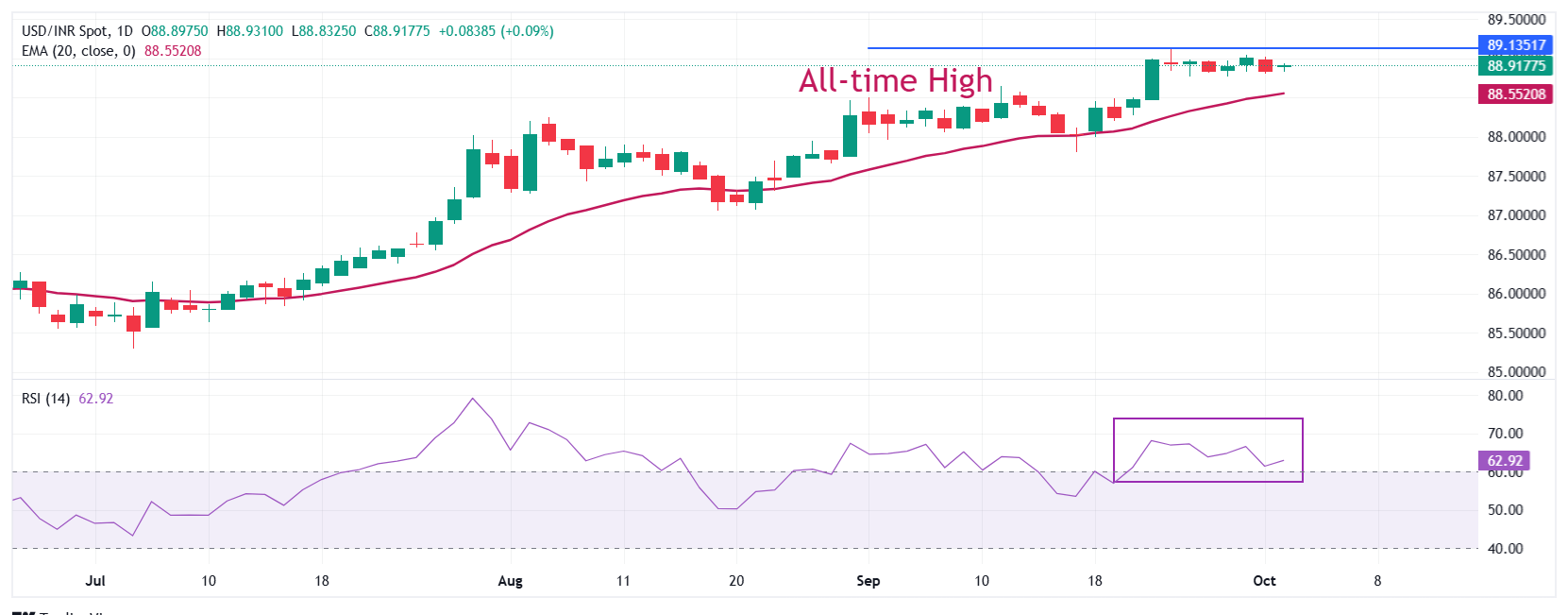 03 Oct 2025 美元/印度卢比:尽管美国政府停摆,但仍保持坚挺,坚定的美联储鸽派押注 0 印度卢比(INR)在周五以约88.90的平稳水平开盘,兑美元(USD),此前周四为假期。不过,美元/印度卢比接近上周创下的约89.12的历史高点 标题:美元/印度卢比:尽管美国政府停摆,但仍保持坚挺,坚定的美联储鸽派押注 地址:www.shudhfilmynews.com/article/44628.html