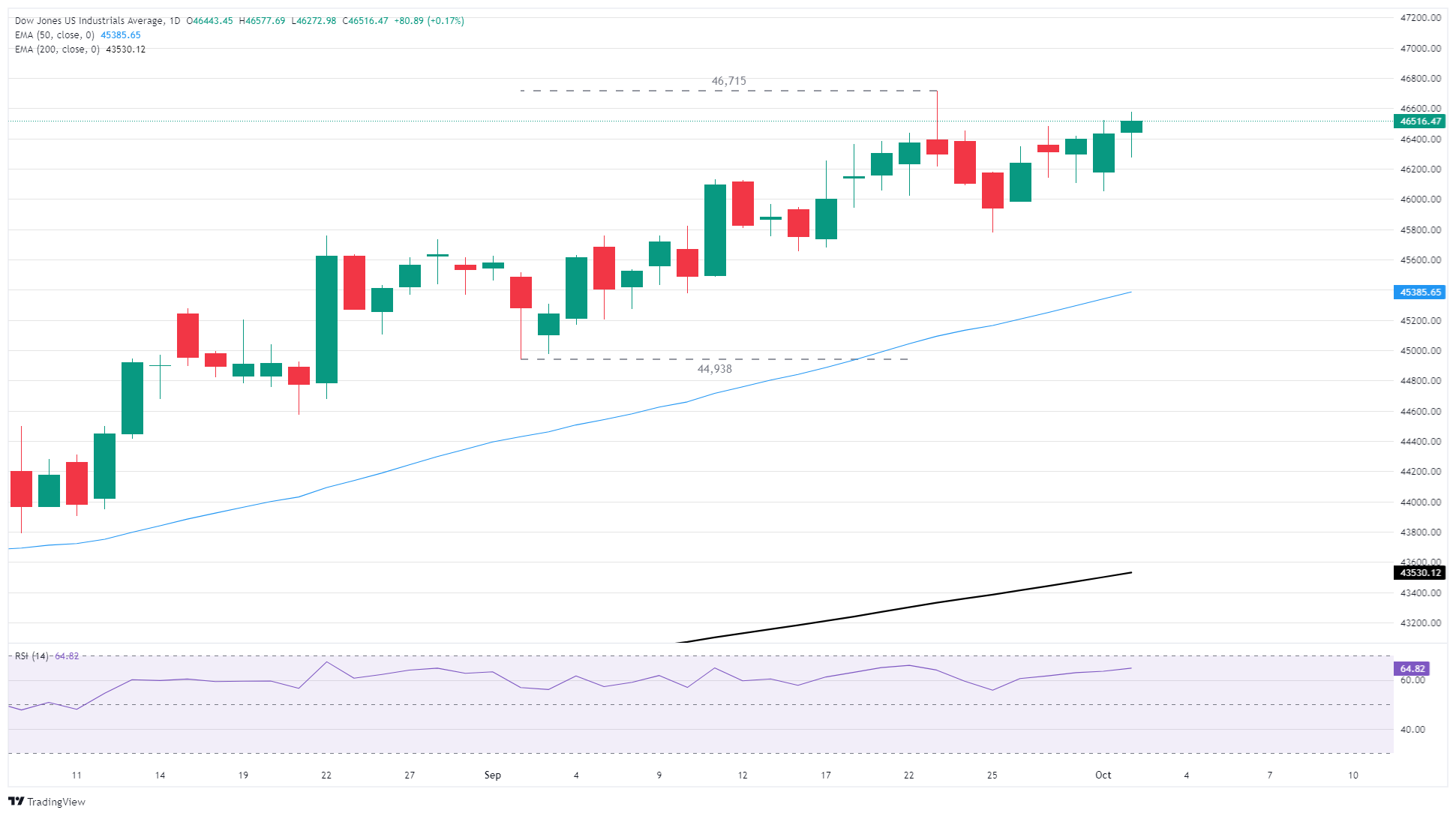 03 Oct 2025 道琼斯工业平均指数在政府停摆生效之际谨慎看涨 0 道琼斯工业平均指数(DJIA)在周四小幅上涨,涨幅约为100点,但仍接近46,500区域,因为股市在等待美国联邦政府的停摆。 标题:道琼斯工业平均指数在政府停摆生效之际谨慎看涨 地址:www.shudhfilmynews.com/article/44655.html