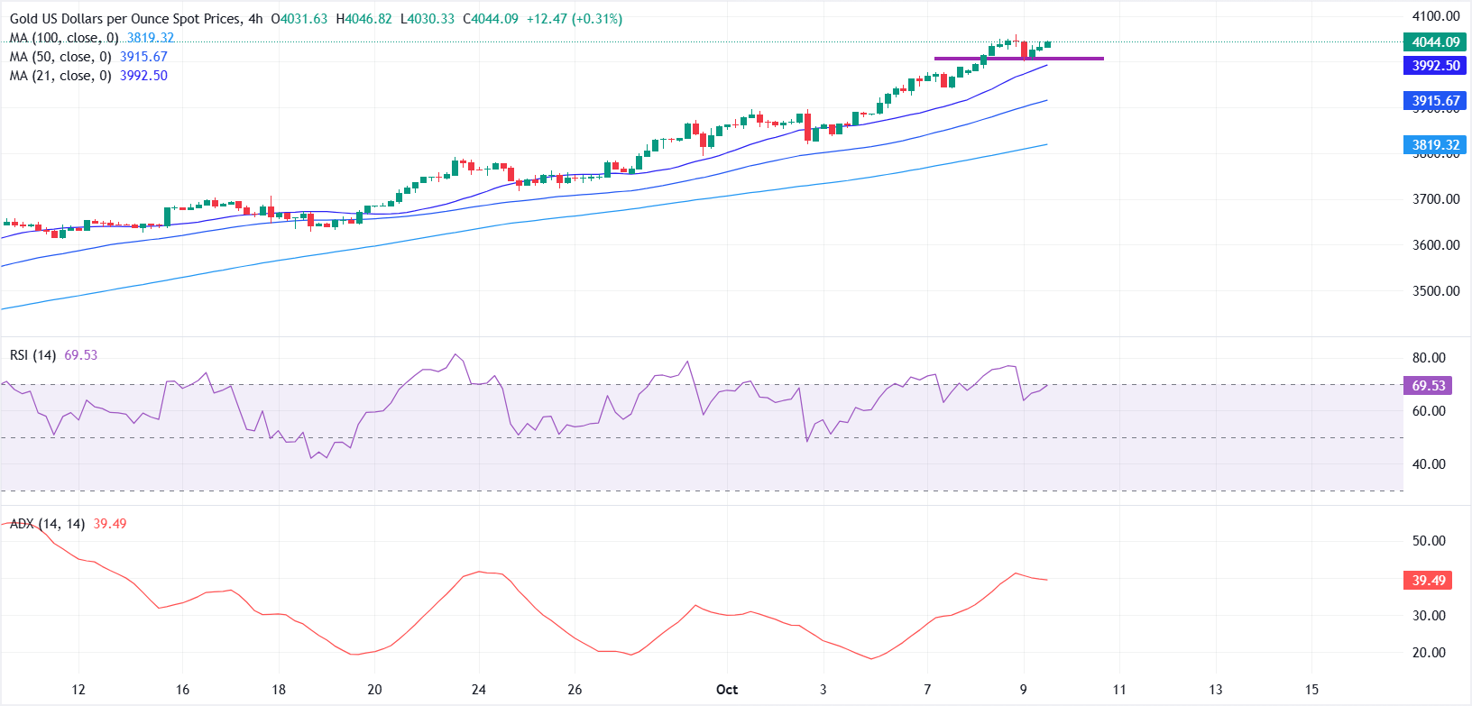 10 Oct 2025 黄金价格稳定在4000美元以上,动能在创下新高后有所减弱 2 黄金(黄金/美元)在周四承受温和压力,此前突破了4000美元的心理关口,并在前一天创下了4059美元的历史新高。撰写时,黄金/美元交易在4025美元附近,日内下跌近0.50%,多头在40050美元的阻力区附近挣扎以延续涨势。 标题:黄金价格稳定在4000美元以上,动能在创下新高后有所减弱 地址:www.shudhfilmynews.com/article/44937.html