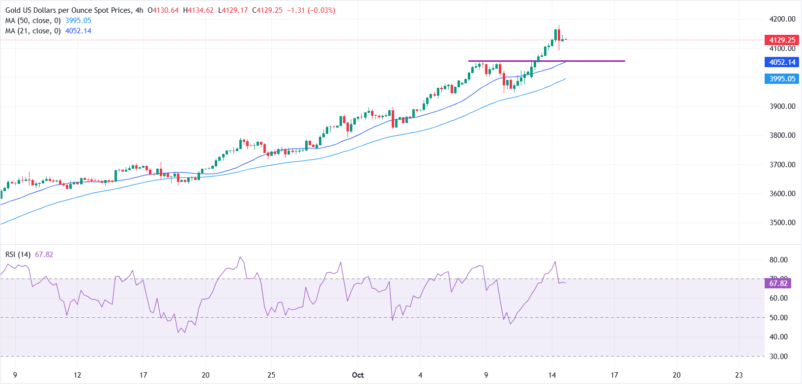 15 Oct 2025 黄金在交易者等待鲍威尔讲话时在历史高位下方整理 3 黄金(黄金/美元)在周二因避险需求持续受到支持而稍作喘息,此前在美国与中国贸易紧张局势加剧、美联储(Fed)鸽派预期和主要经济体不确定性增加的背景下,金价早些时候飙升至4179美元的新历史高点。 标题:黄金在交易者等待鲍威尔讲话时在历史高位下方整理 地址:www.shudhfilmynews.com/article/45114.html