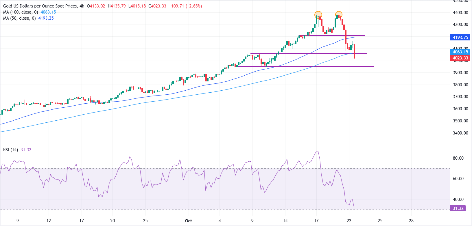 黄金(黄金/美元)在经历了前一天的剧烈抛售后,试图在周三稳定下来,随着美元(USD)的走软,找到了一些支撑。截至发稿时,黄金/美元交易在约4040美元,较早前短暂跌至4004美元,跌幅超过1.50%。 标题:黄金稳住在4000美元以上,因美元失去动能