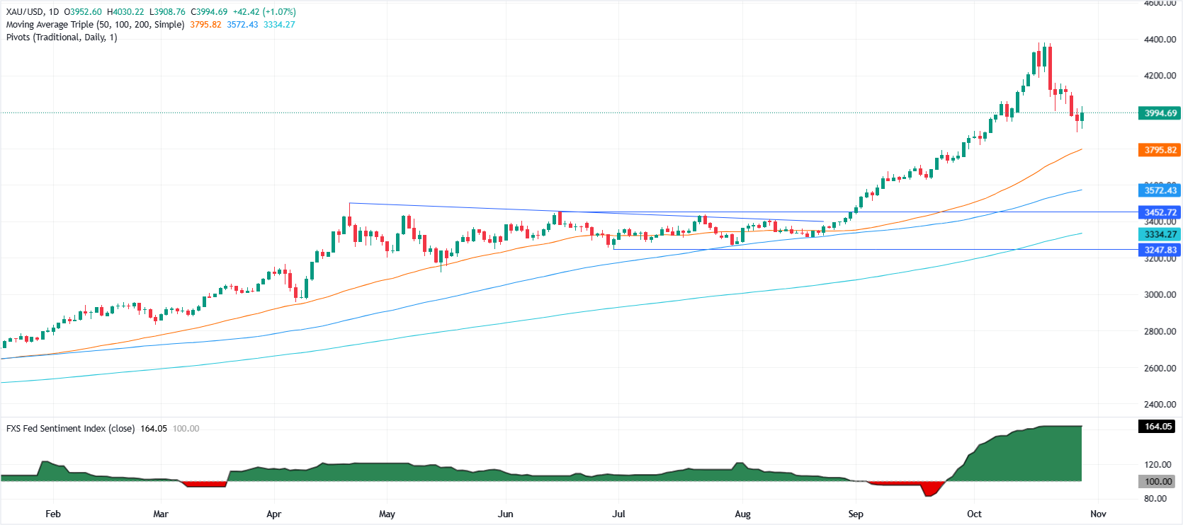 金价上涨,因为美联储(Fed)决定如预期在周三将利率下调25个基点,尽管并非全体一致。在撰写本文时,黄金/美元在3,990至4,010美元区间内波动,交易商正为美联储主席杰罗姆-鲍威尔的新闻发布会做准备 标题:金价在美联储宣布25个基点的降息后稳定在4000美元附近