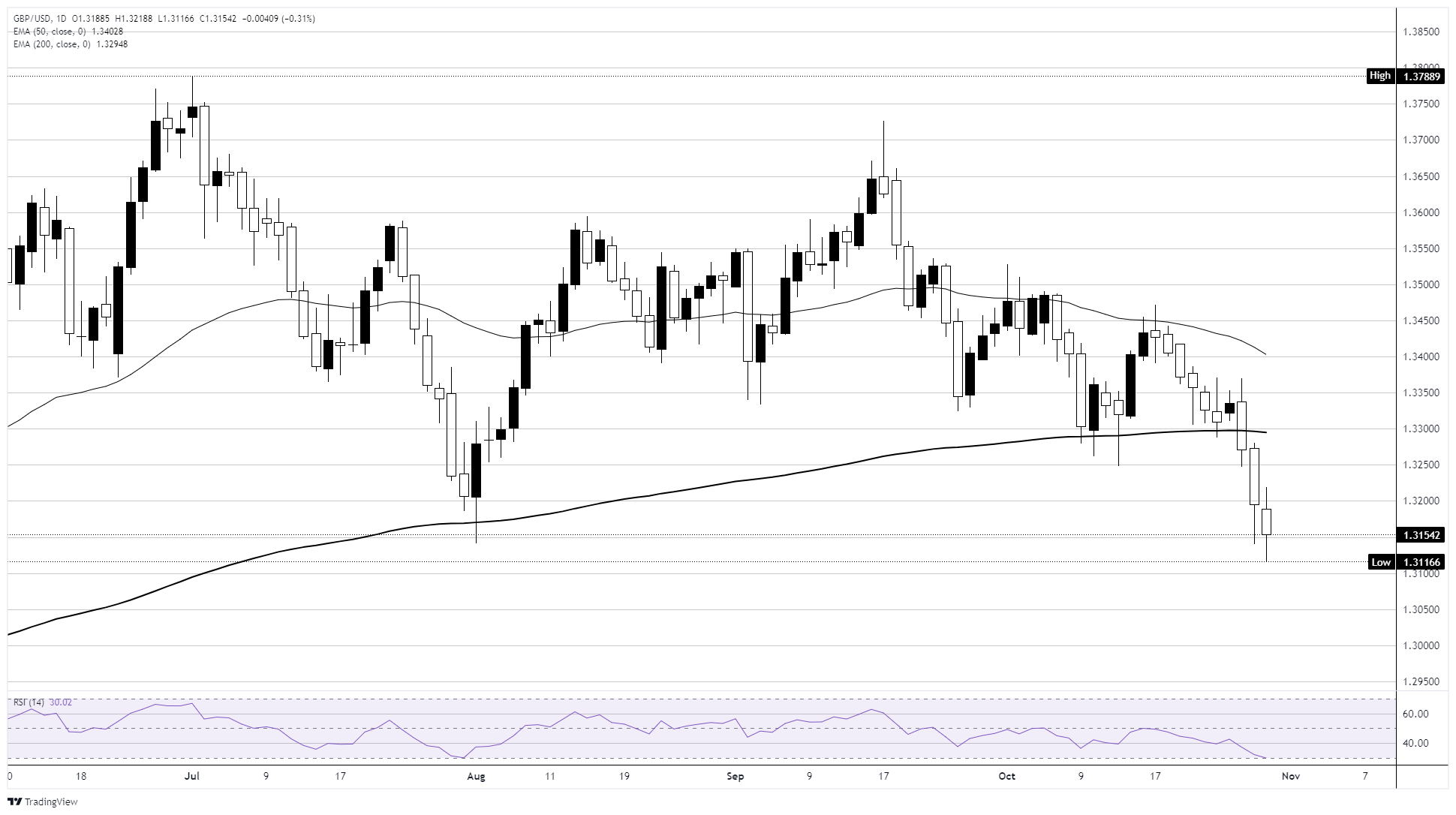 英镑/美元周四再次下跌,逐渐逼近1.3100关口,并跌至六个月低点1.3116。英镑(GBP)继续对美元(USD)贬值,仅在十月份就下跌超过2%对美元。 标题:英镑/美元测试六个月低点,英镑继续下跌