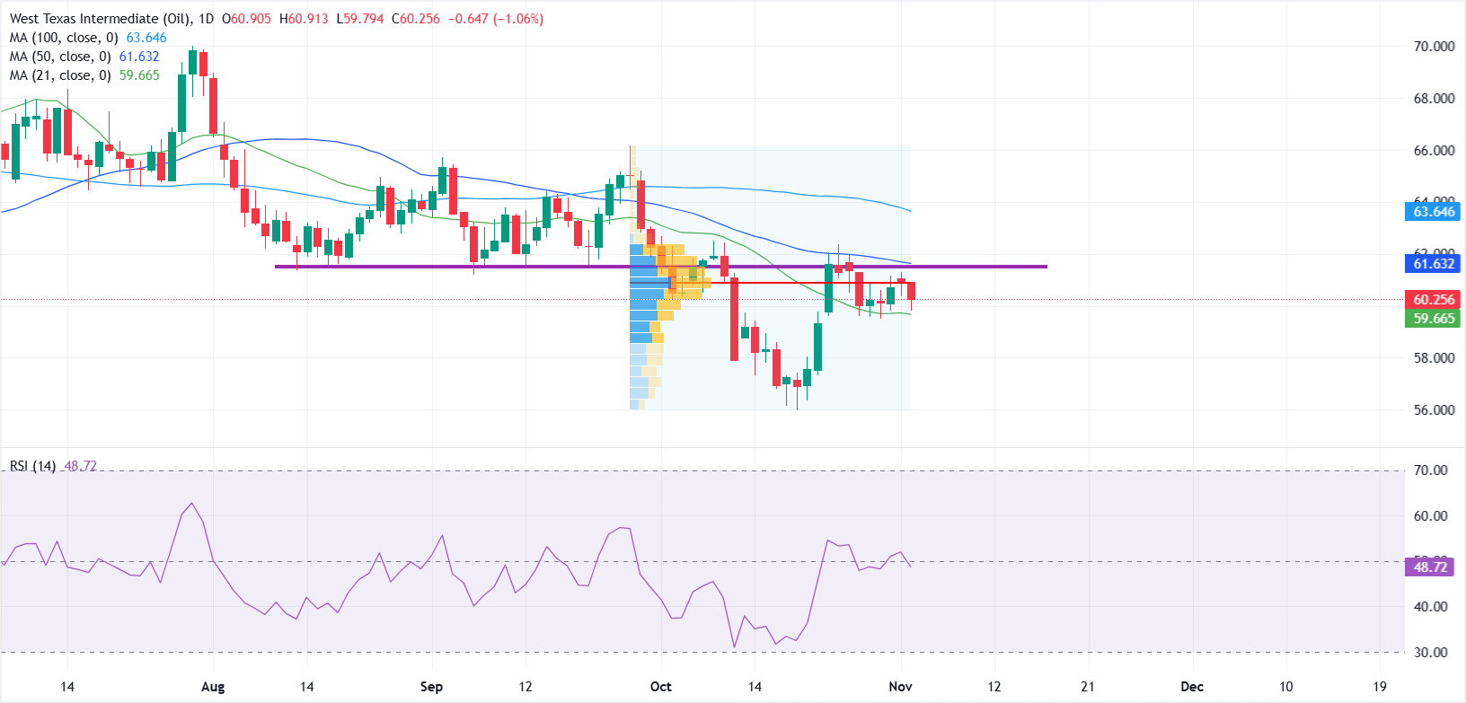 西德克萨斯中质原油(WTI)周二交易疲软,交易者消化最新的欧佩克+决定,暂停计划中的供应增加,持续的过剩供应担忧限制了上涨动能。在撰写本文时,WTI价格约为每桶60.20美元,经过短暂下滑至59.79美元后略有回升,日内下跌近1.10%。 标题:WTI价格预测:在50日和100日简单移动平均线下,仍然保持看跌偏向