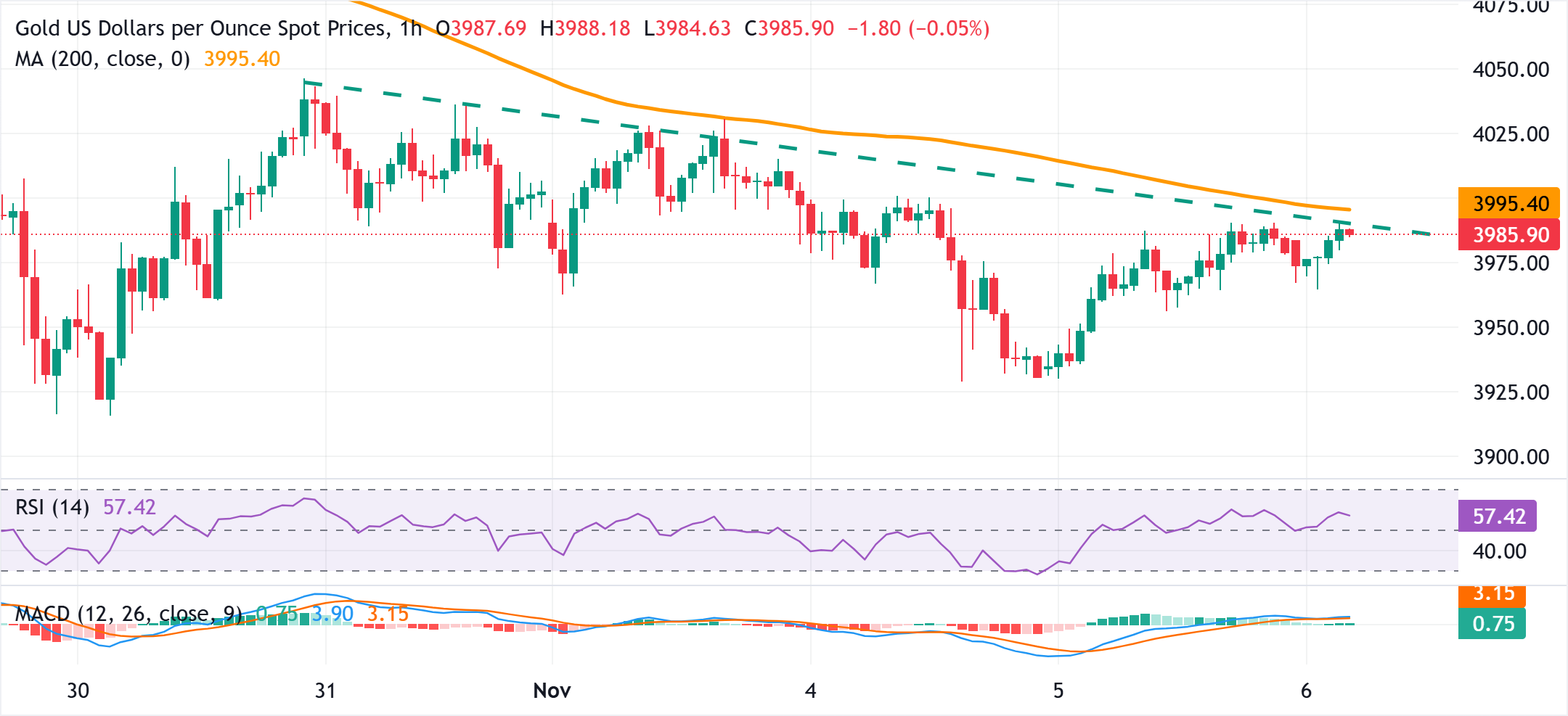 黄金(黄金/美元)周四连续第二天以积极的偏向交易,尽管缺乏看涨信心,并在亚洲时段仍低于4000美元的心理关口 标题:金价因美元走软小幅上涨;减少的12月美联储降息押注限制了涨幅