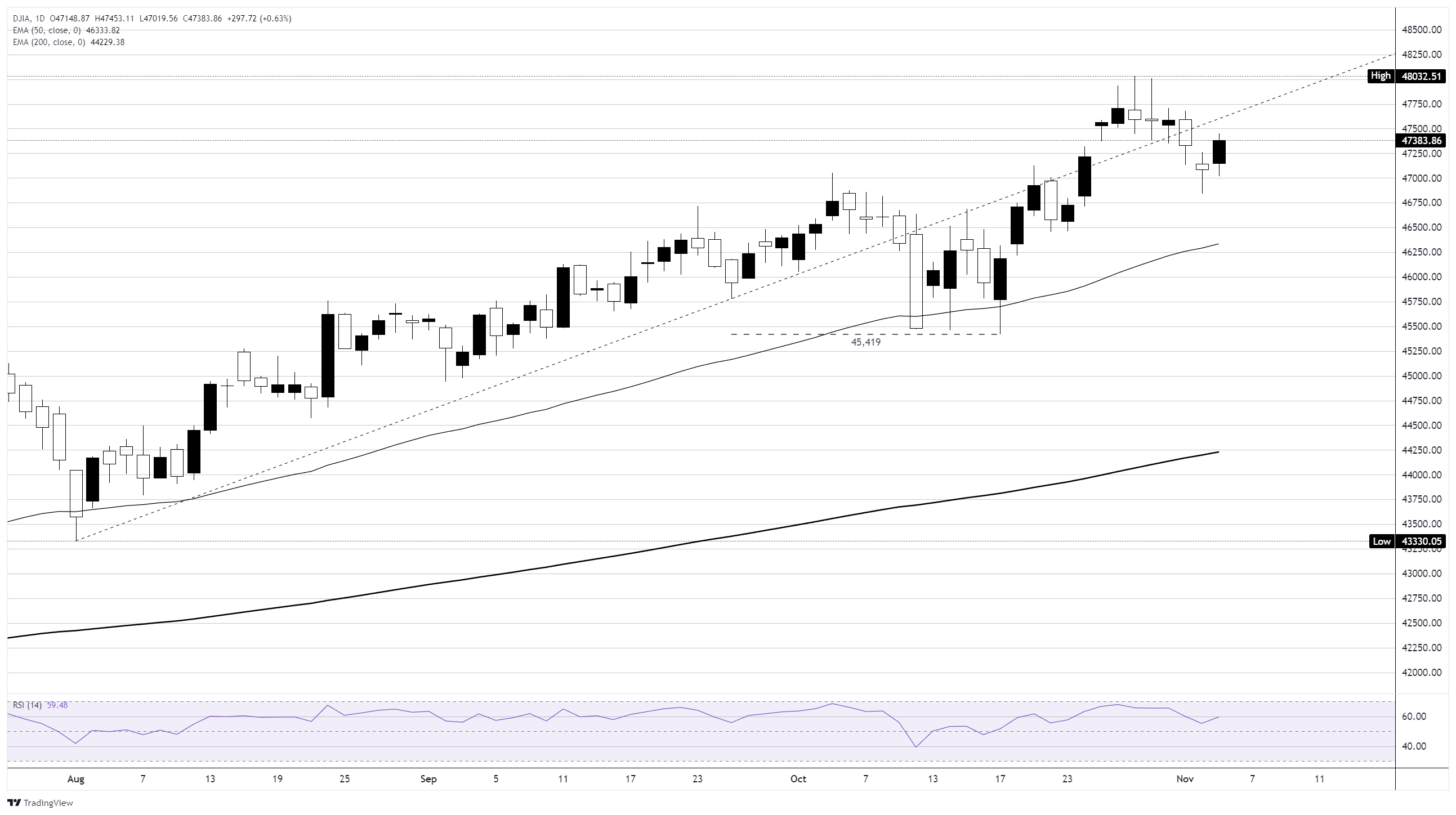 道琼斯工业平均指数(DJIA)在周三抑制了看跌走势,在接近47,200水平附近找到短期支撑,并上涨300点,因为股市在本周初在高度集中于人工智能和科技基础设施板块的暴跌后恢复。 标题:道琼斯工业平均指数反弹300点,市场恢复稳定